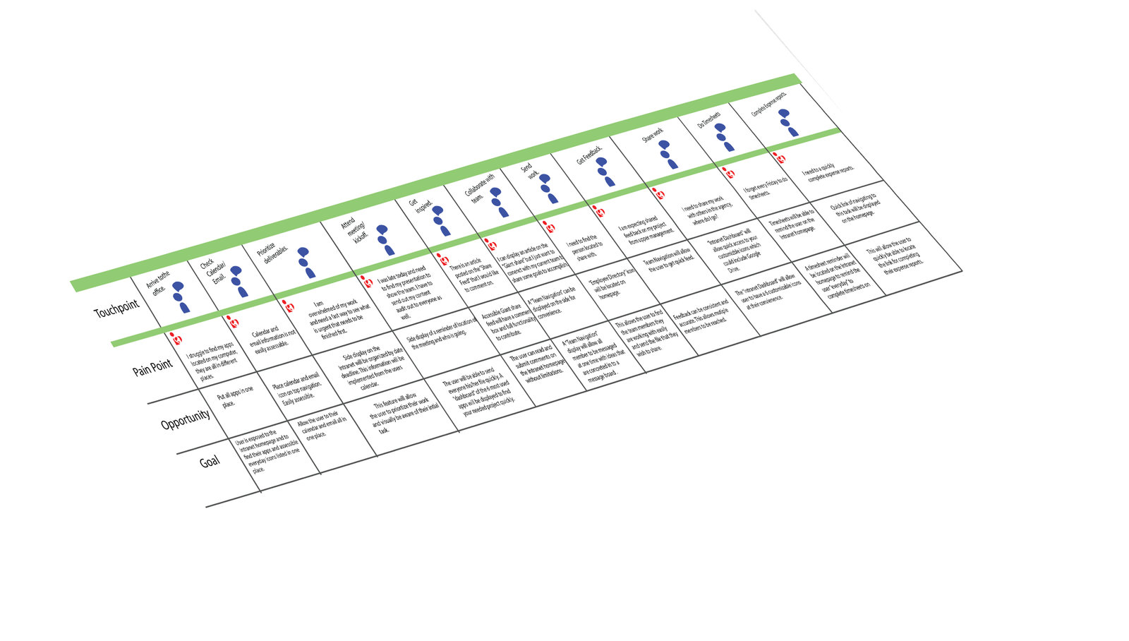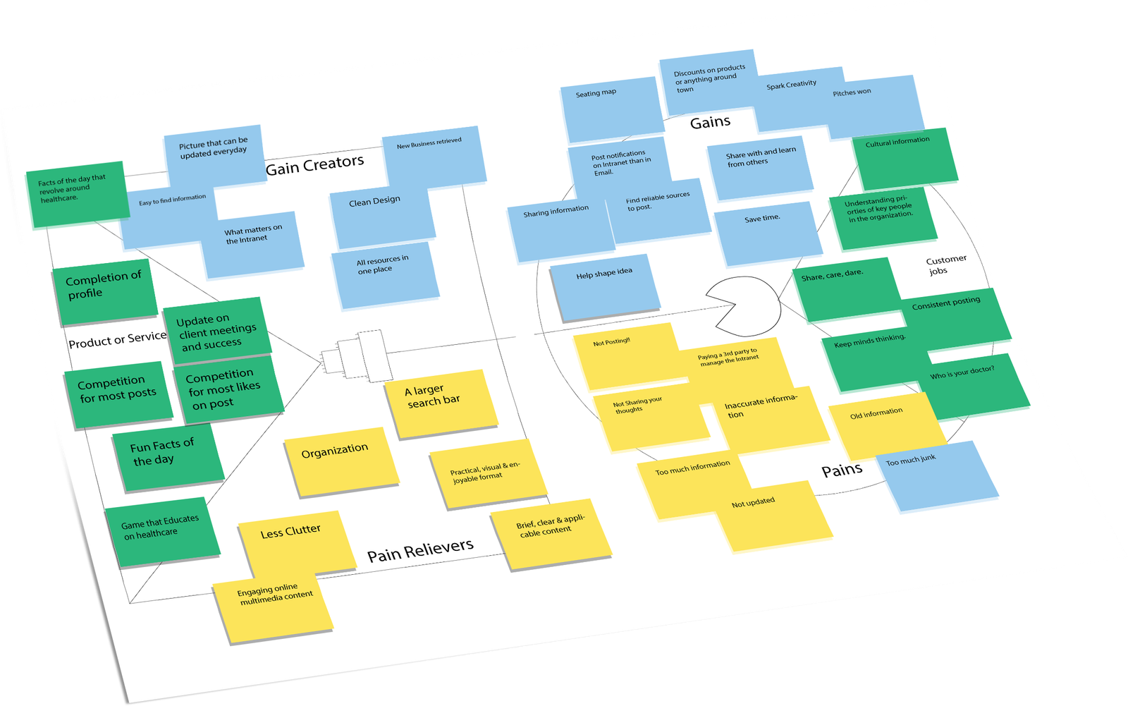 From a value proposition standpoint, we observed that employees had key “jobs to be done,” like finding HR resources, team updates, and tools quickly—yet experienced negative emotions like confusion or frustration (pains) due to poor structure.