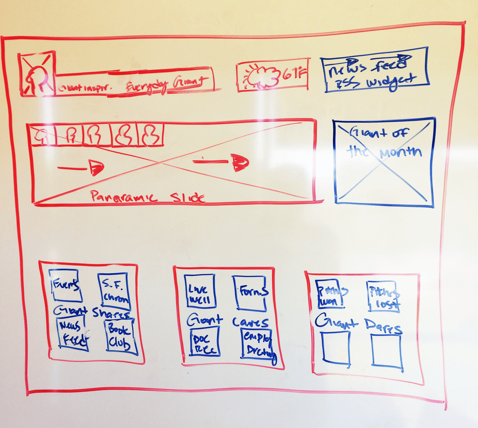 Elements like the panoramic slideshow, “Giant of the Month” spotlight, and quick-link boxes for events, forms, employee directories, and wellness resources were all directly inspired by user-stated needs for clarity, visibility, and community engagement. The sketch helped stakeholders align on content hierarchy and gave the design team a tangible starting point to move into wireframing.