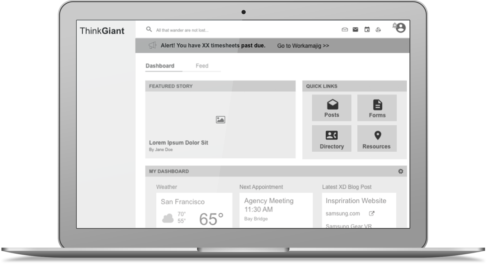 To address this, we designed wireframes that prioritized user tasks over organizational structure. We created a modular layout with clearly labeled sections, including quick links for instant access to top-used items like forms, posts, and resources, personalized dashboards that surface meetings, weather, unread emails, and blog updates, and a split view for Dashboard and Feed to separate internal tools from community updates.