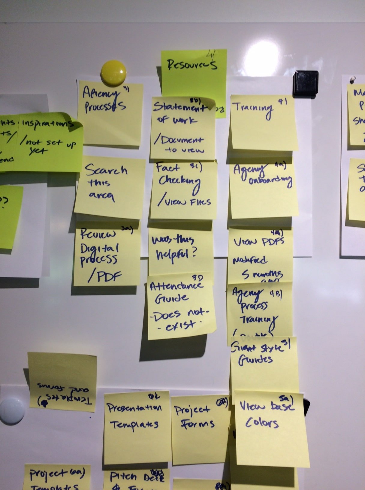 Notes like “Statement of Work,” “View base colors,” and “Collaboration Engine” revealed how siloed content and inconsistent labels slowed down everyday tasks. Missing items like “Attendance Guide – does not exist” underscored gaps in the system.