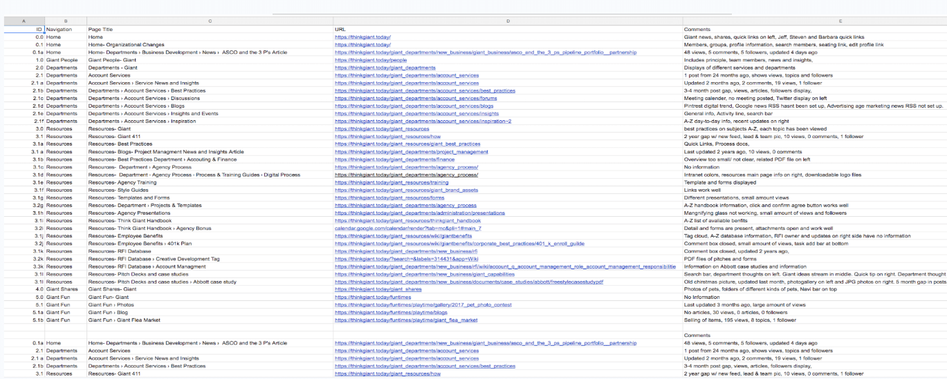 A key step in this process is conducting a comprehensive content audit—listing all site content in a centralized spreadsheet that includes navigation titles, page names, URLs, comments, and content hierarchy.