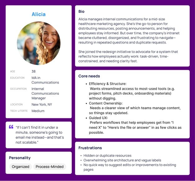 Insights from personas like Alicia—an Internal Communications Manager juggling information requests—highlighted the urgency of reorganizing the intranet. She needed fast access to tools like pitch decks, attendance guides, and onboarding templates to reduce repetitive emails and scale internal communication.