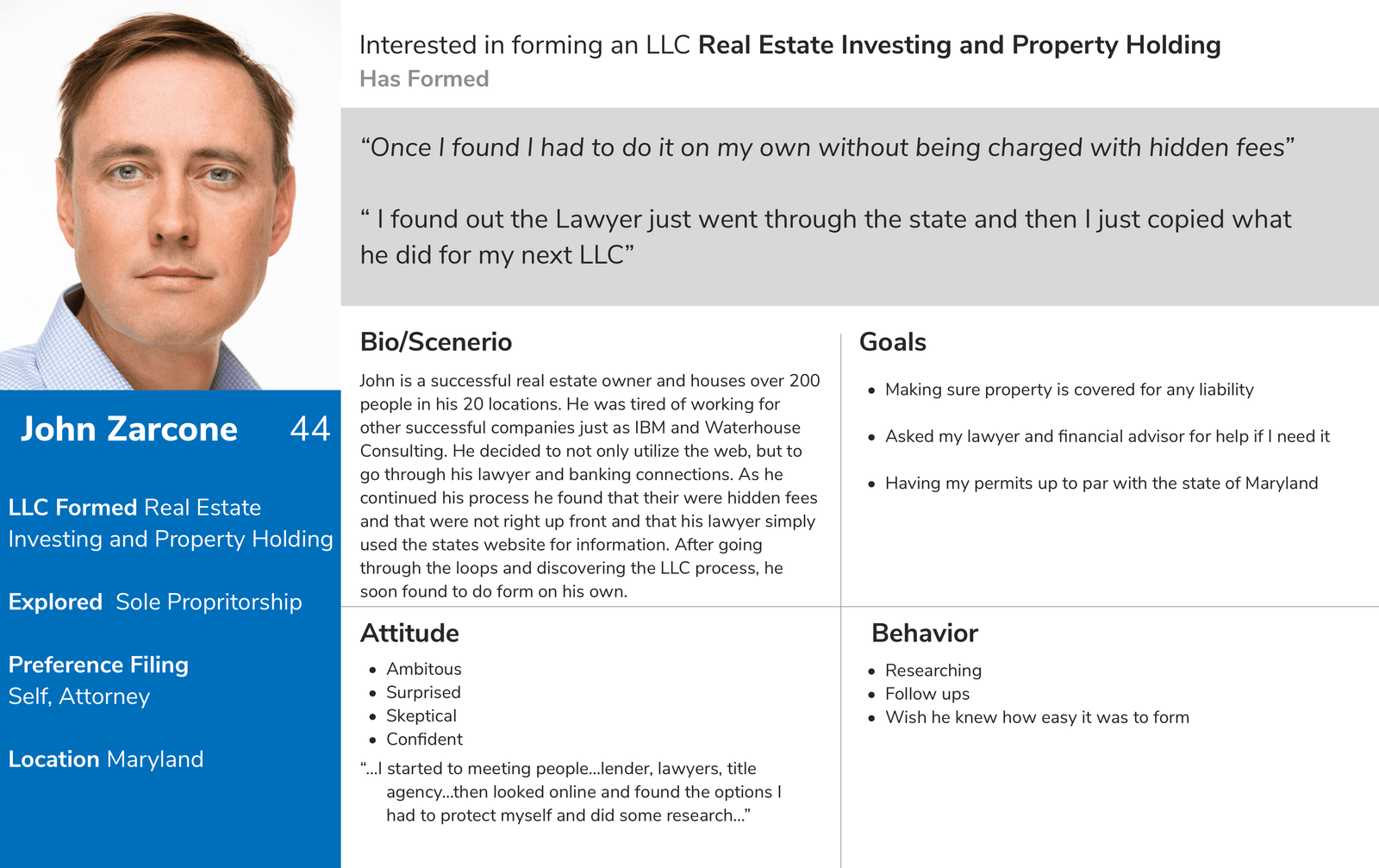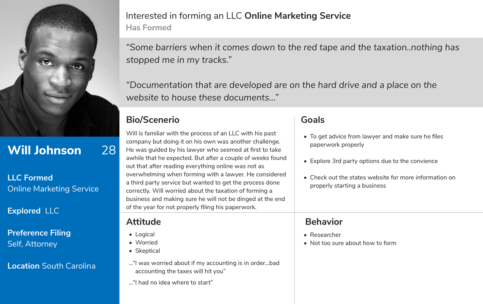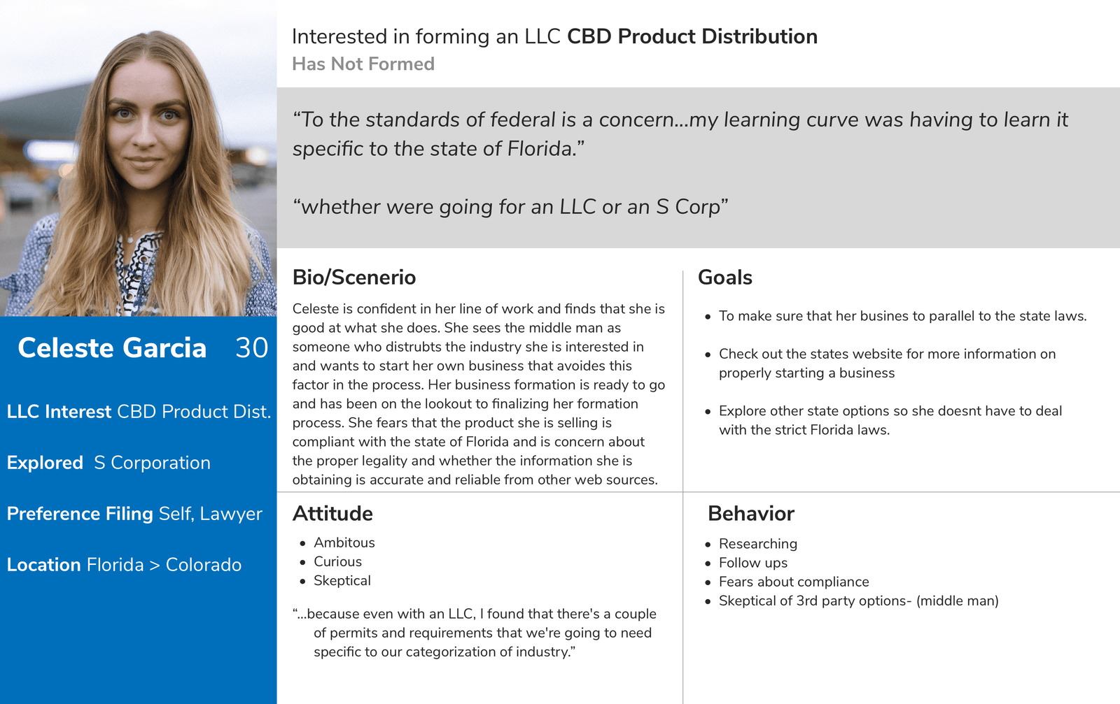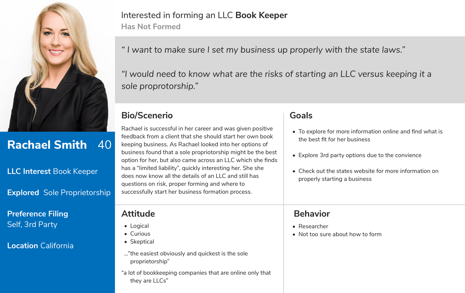 The client's goals were decided on what kind of business they would need to form and whether or not they were ready. We also tested users who have already formed and found what the convenience and inconvenience were to the process. Many were confident when they formed their business such as an LLC but others who wanted to form another entity were not so sure. Concerns were liability, laws and the proper information.