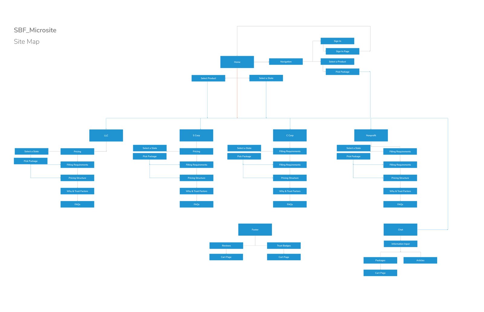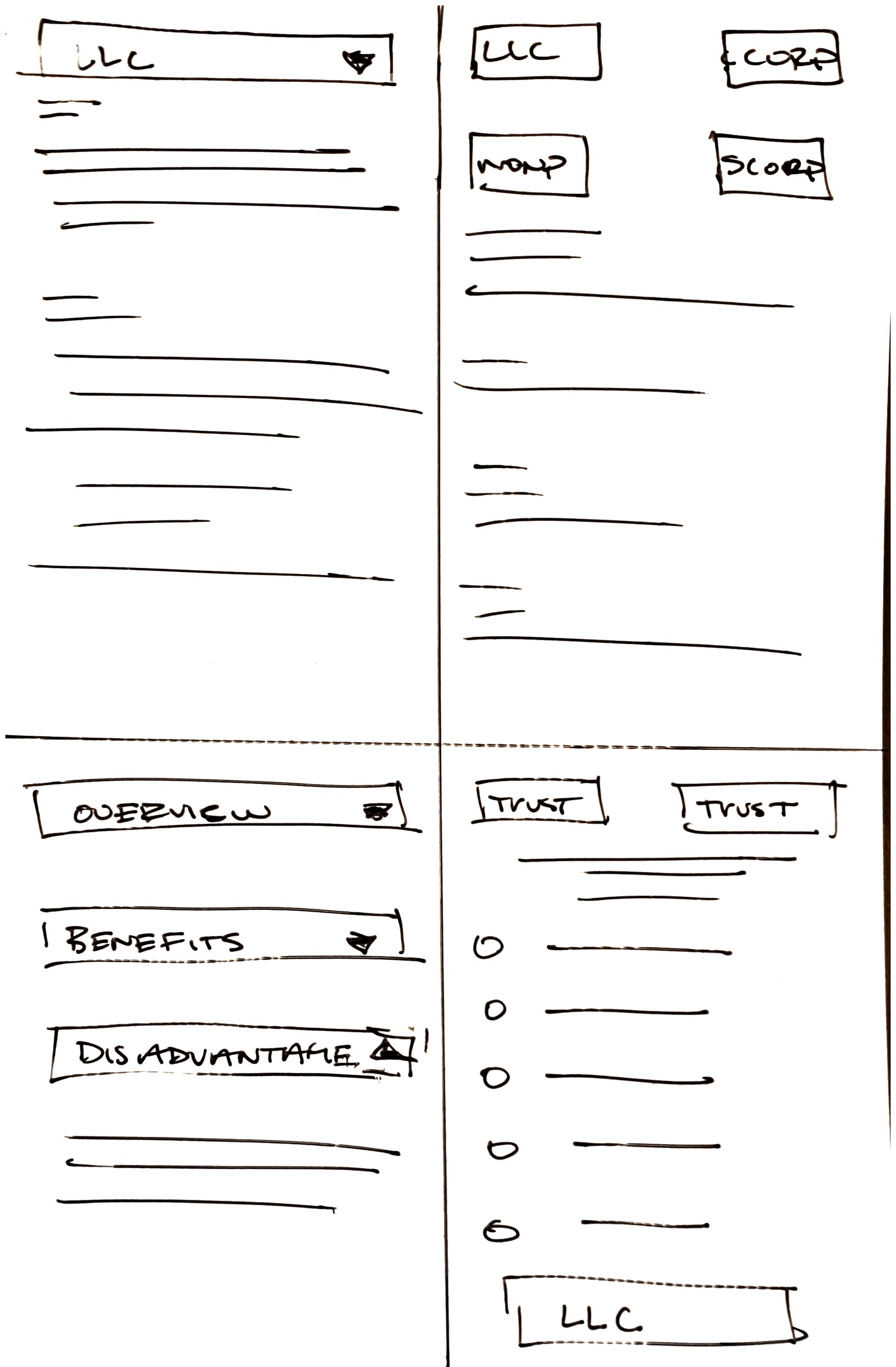 Before starting, I identified 5 main screens for this application: the landing page , LLC page, C Corporation page, S Corporation page, Nonprofit and Reviews.