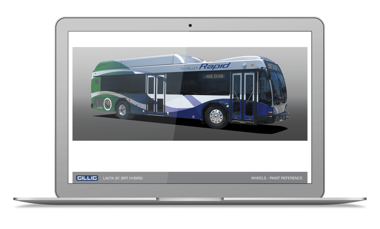 To ensure the wrap fit the physical dimensions and mechanical constraints of the vehicle, I used GILLIG’s official bus design templates—shown here—to draft and align the wrap artwork with precision. I translated curved motion elements from the Rapid bus design into the Wheels layout, replacing angular cuts and heavy shadows with sweeping arcs and balanced gradients.
