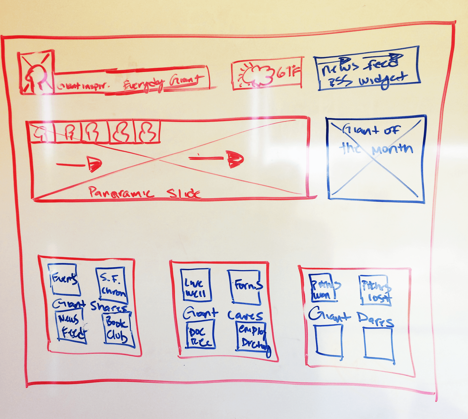 Elements like the panoramic slideshow, “Giant of the Month” spotlight, and quick-link boxes for events, forms, employee directories, and wellness resources were all directly inspired by user-stated needs for clarity, visibility, and community engagement. The sketch helped stakeholders align on content hierarchy and gave the design team a tangible starting point to move into wireframing.