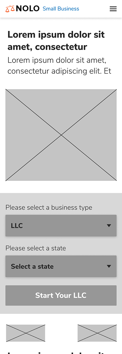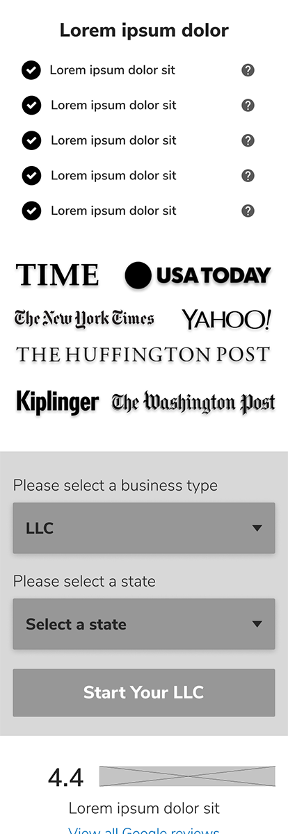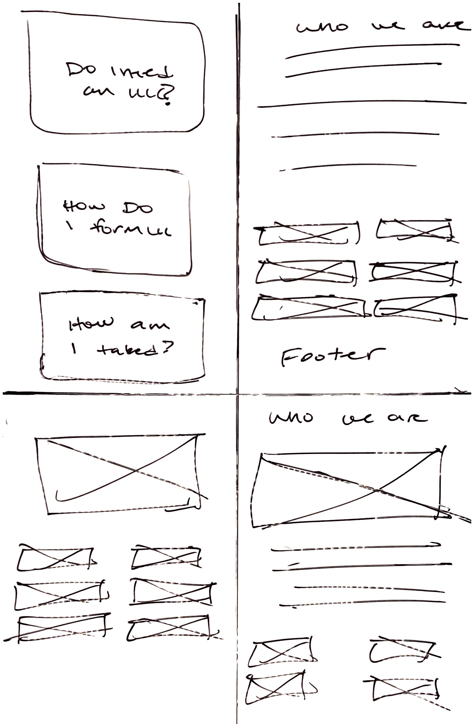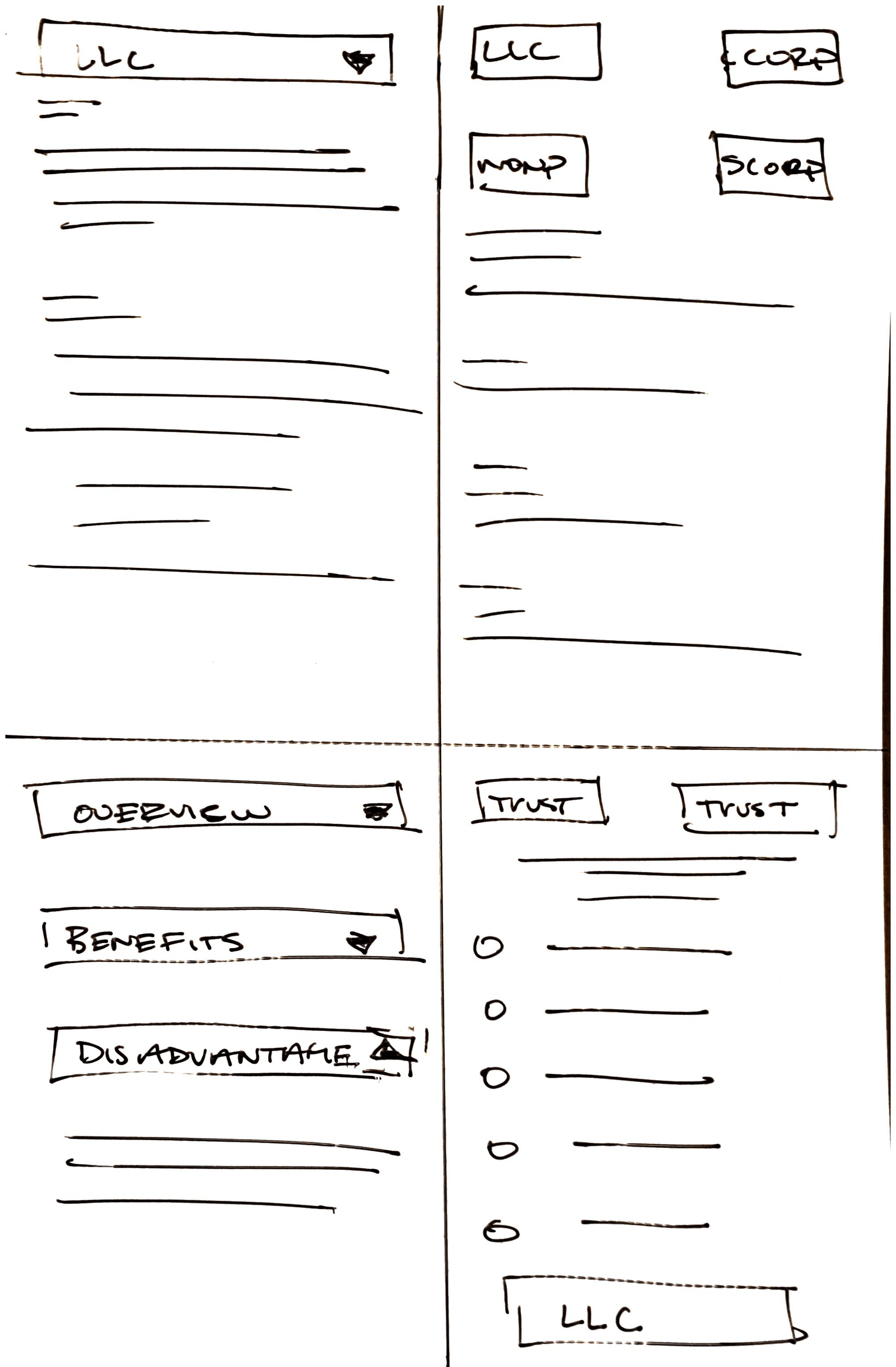 Before starting, I identified 5 main screens for this application: the landing page , LLC page, C Corporation page, S Corporation page, Nonprofit and Reviews.
